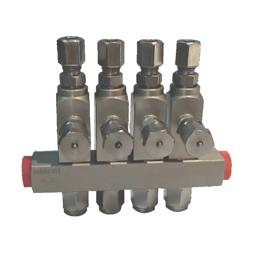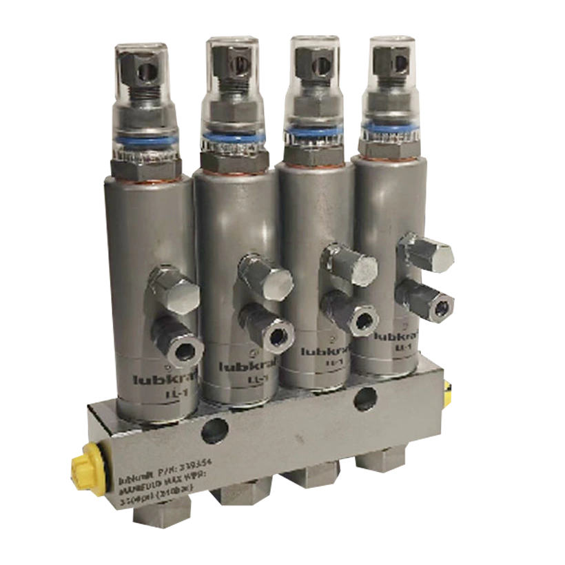 Os dosadores da série LL-V são para sistemas de lubrificação automática de linha simples e alta pressão, distribuindo lubrificantes compatíveis com vedações de fluoroelastômero e viscosidade de até NLGI #2. A vazão é ajustável externamente, e uma haste indicadora permite verificação visual do funcionamento. Cada dosador individual pode ser facilmente removido para inspeção ou substituição.